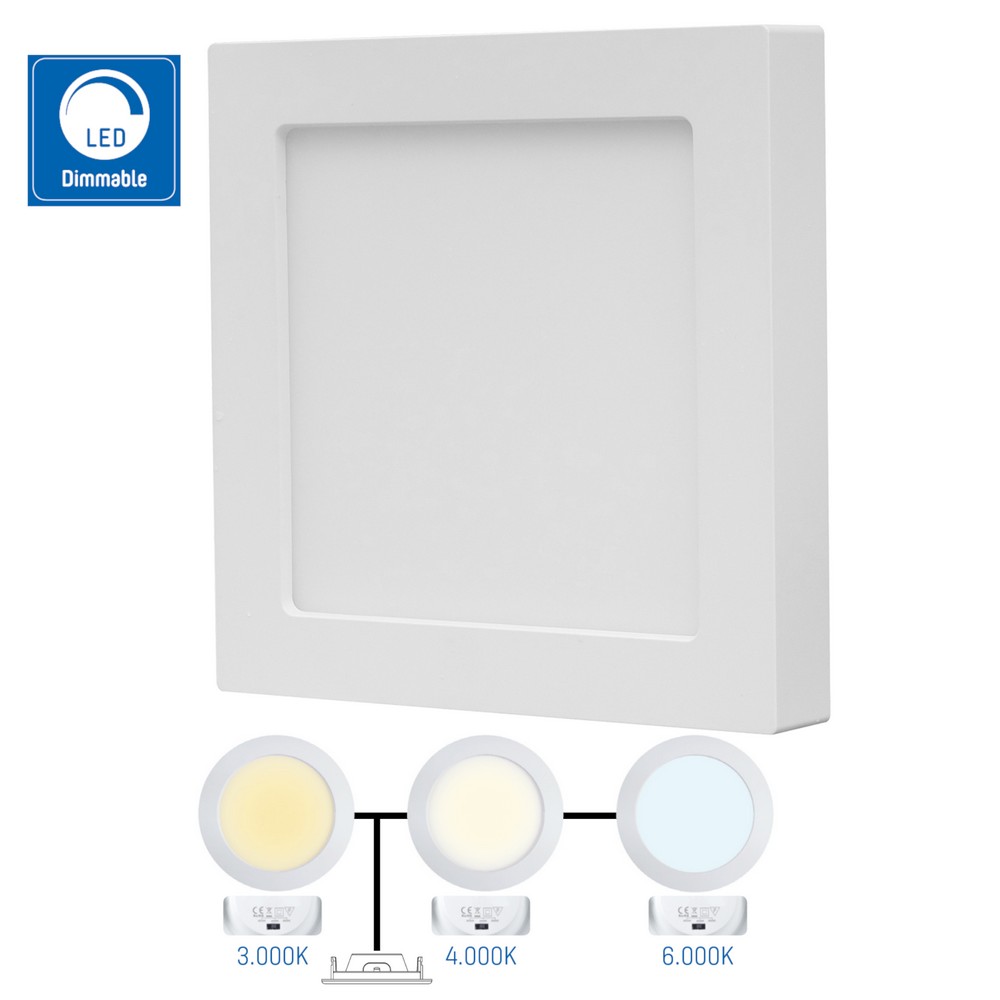 Fyrkantig LED allt-i-ett-panel med ram. Den här panelen har en färgomkopplare (CCT) med 3 inställningar, med vilka du kan ställa in ljuset till varmvitt (3000K), neutralt vitt (4000K) och dagsljusvitt (6000K). Den här panelen är dimbar i alla tre inställningarna. Du kan installera panelen på två sätt; infälld montering i ett systemtak (IP44, skyddat mot damm och vatten) eller så kan du använda den medföljande ramen för ytmontering på alla andra typer av tak (IP20). Denna energieffektiva panel producerar 1440Lm ljus med endast 18W energiförbrukning och har en livslängd på 25 000 timmar. Produktdimensioner: 35x226x226mm. Installationsstorleken är 220x220x32mm. Installationshål från 200x200 mm krävs för inbyggnad.
