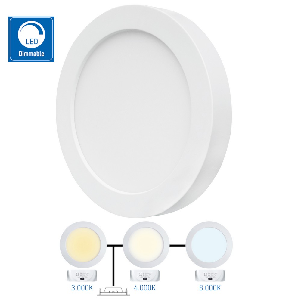 Rund LED allt-i-ett-panel med ram. Den här panelen har en CCT-switch med 3 inställningar, som gör att du kan växla ljusets färgtemperatur mellan varmvit (3000K), neutral vit (4000K) och dagsljusvit (6000K). Panelen är dimbar i alla tre inställningarna. Du kan installera den här panelen på två sätt; du kan montera det infällda i det upphängda taket (IP44-skydd mot damm och vatten) eller så kan du använda den medföljande ramen för att ytmontera den till alla typer av tak (IP20). Denna energieffektiva panel producerar 1600Lm vid endast 20W energiförbrukning och har en livslängd på 25.000 timmar. Produktstorlekar: 35x247mm. Receststorleken är 240x32 mm. Installationshål på Ø220 mm krävs för inbyggnad.