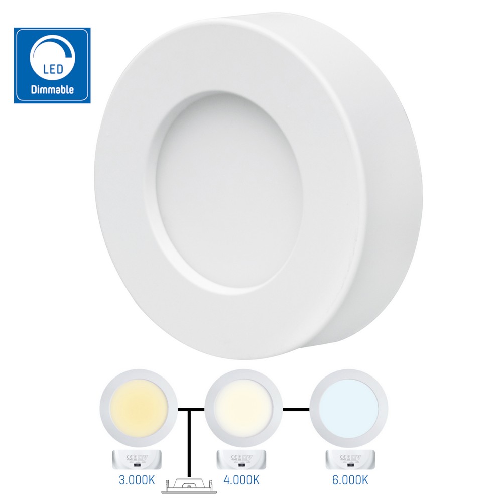 Rund LED allt-i-ett-panel med ram. Den här panelen har en färgomkopplare (CCT) med 3 inställningar, med vilka du kan ställa in ljuset till varmvitt (3000K), neutralt vitt (4000K) och dagsljusvitt (6000K). Den här panelen är dimbar i alla tre inställningarna. Du kan installera panelen på två sätt; infälld montering i ett systemtak (IP44, skyddat mot damm och vatten) eller så kan du använda den medföljande ramen för ytmontering på alla andra typer av tak (IP20). Denna energieffektiva panel producerar 450Lm ljus med endast 7,5 W energiförbrukning och har en livslängd på 25 000 timmar. Produktdimensioner: 35x122mm. Installationsstorleken är 115x32 mm. Installationshål på Ø98 mm krävs för inbyggnad.