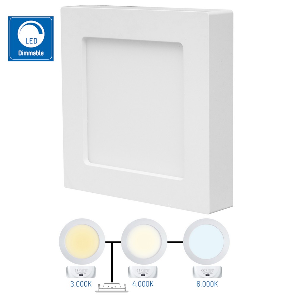 Fyrkantig LED allt-i-ett-panel med ram. Den här panelen har en färgomkopplare (CCT) med 3 inställningar, med vilka du kan ställa in ljuset till varmvitt (3000K), neutralt vitt (4000K) och dagsljusvitt (6000K). Den här panelen är dimbar i alla tre inställningarna. Du kan installera panelen på två sätt; infälld montering i ett systemtak (IP44, skyddat mot damm och vatten) eller så kan du använda den medföljande ramen för ytmontering på alla andra typer av tak (IP20). Denna energieffektiva panel producerar 900Lm ljus med endast 12W energiförbrukning och har en livslängd på 25 000 timmar. Produktdimensioner: 35x172x172mm. Installationsstorleken är 170x170x32mm. Installationshål från 147x147 mm krävs för inbyggnad