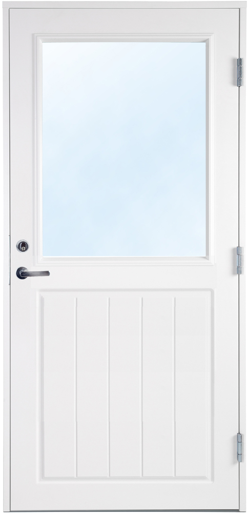Dörren är dekorerad nedtill på både in- och utsida. Fönstret är en 2-glas isolerruta med Argon vilket ger ett lågt U-värde.