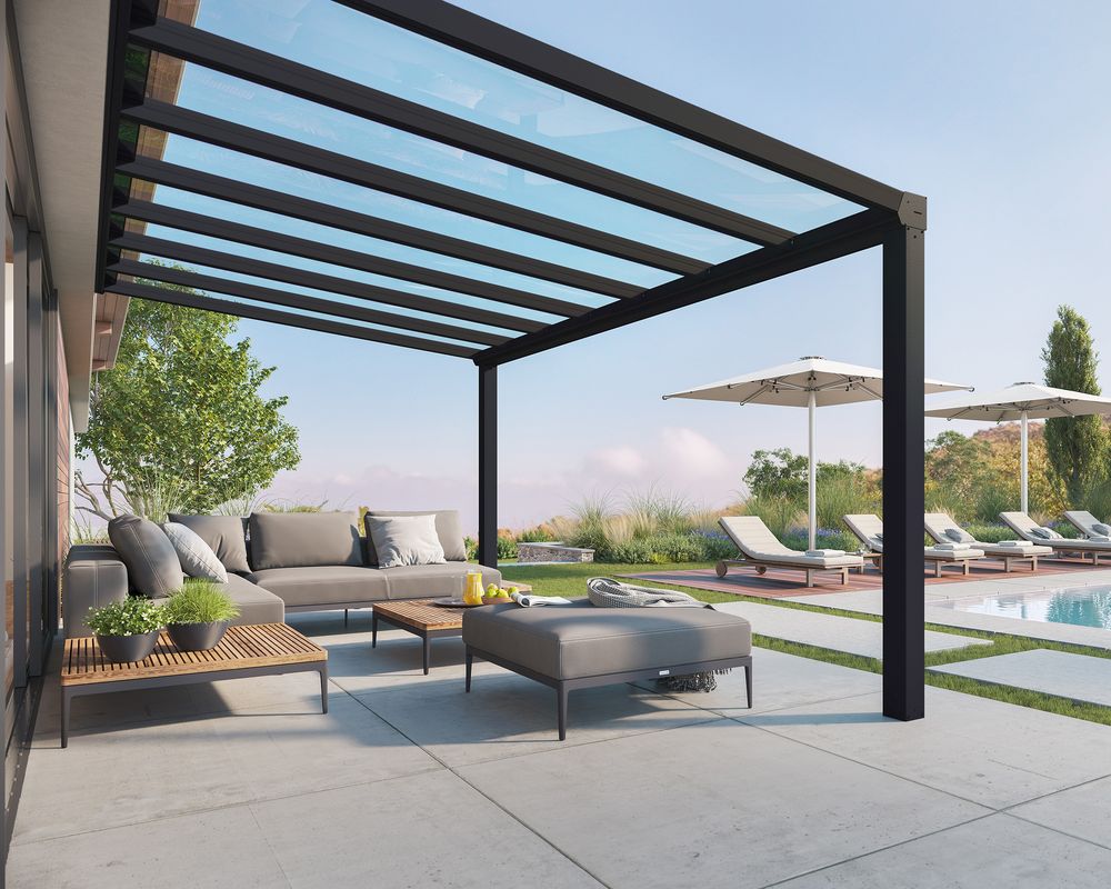 Altantakets konstruktion är rejäl och tillverkad av pulverlackerad aluminium med markfästen i galvaniserat stål, mycket motståndskraftigt mot korrosion (bl a rost). Det fiffiga med stolparna är att de har dolda integrerade stuprör som är sammankopplade med de integrerade takrännorna.Takpanelen är i klar 4 mm polykarbonat som är oerhört slagtålig och dessutom skyddar både människor och möbler mot skadlig UV-strålning.