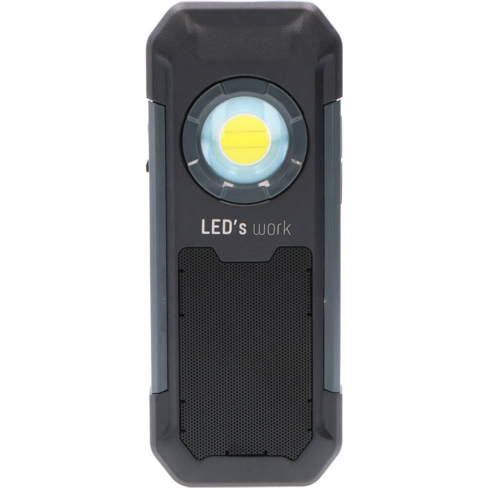 Kompakt arbetslampa med Bluetooth-högtalare.