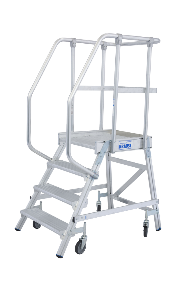 Denna arbetsplattform är gjord av aluminium, vilket gör den hållbar och stabil. Plattformen har hjul som gör den väldigt lätt att transportera, plattformen är även formad så att den kan stå tätt intill hyllor, väggar med mera. Trappan har 4 steg och en höjd på ca 1,95 meter, vilket kan ge dig en arbetshöjd på ca 2,95 meter.