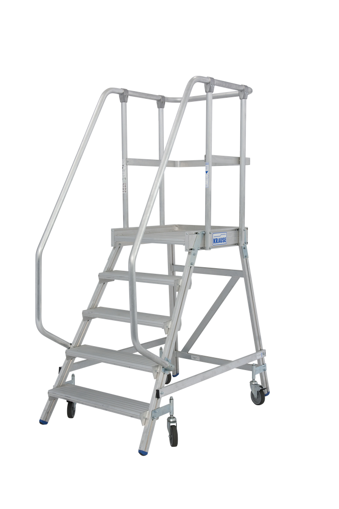 Denna arbetsplattform är gjord av aluminium, vilket gör den hållbar och stabil. Plattformen har hjul som gör den väldigt lätt att transportera, plattformen är även formad så att den kan stå tätt intill hyllor, väggar med mera. Trappan har 5 steg och en höjd på ca 2,20 meter, vilket kan ge dig en arbetshöjd på ca 3,20 meter.