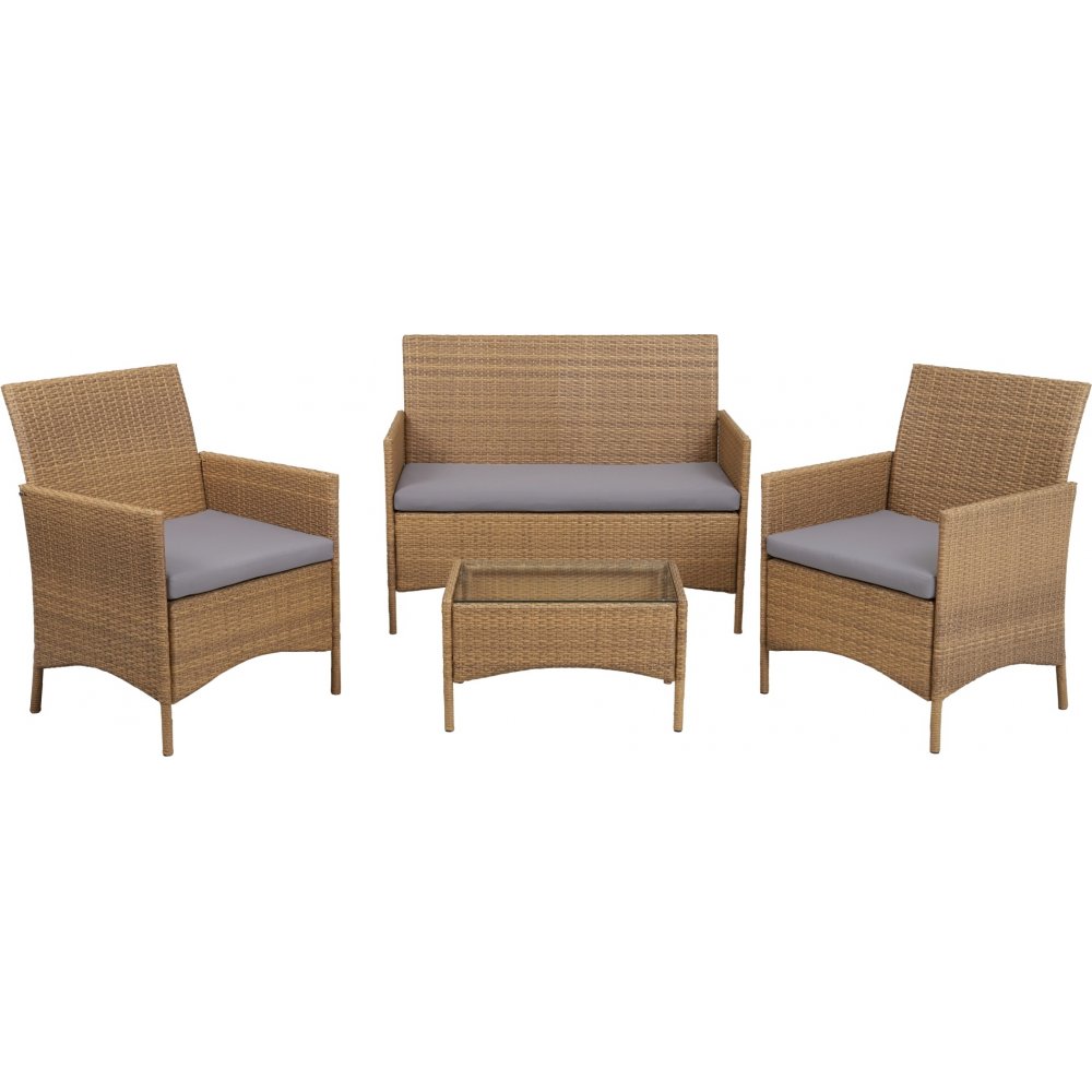 Atlanta utegrupp i naturfärgad konstrotting (6-8 mm) med matchande mörkgrå dynor av polyester. Väderbeständig stomme av metall. Bordet har en toppskiva av härdat glas.