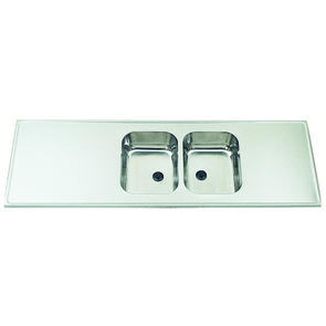 Vändbar heltäckande diskbänk med två stora lådor och avrinningsplan. Levereras med två proppar/sil, bräddavlopp och vattenlås.