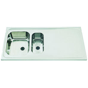 Vändbar heltäckande diskbänk med stor och liten låda. Levereras med två proppar/sil, bräddavlopp och vattenlås.
