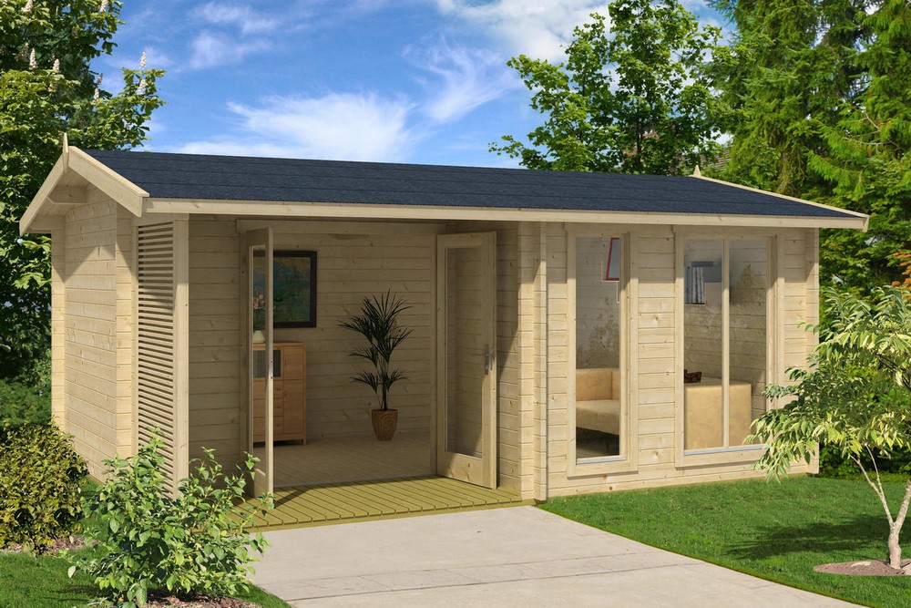 Attefallshus Benjamin är ett klassiskt timmerhus med stora fönster och dubbeldörrar i glas, vilket ger stugan en modern design och ett fint ljusinsläpp. Med tak över ingången får du både 3 m² uteplats med snyggt vindskydd och en fin entré till din stuga. 15,36 m² blir en lagom stor gäststuga, extra rum till tonåringen eller ett hemmakontor.