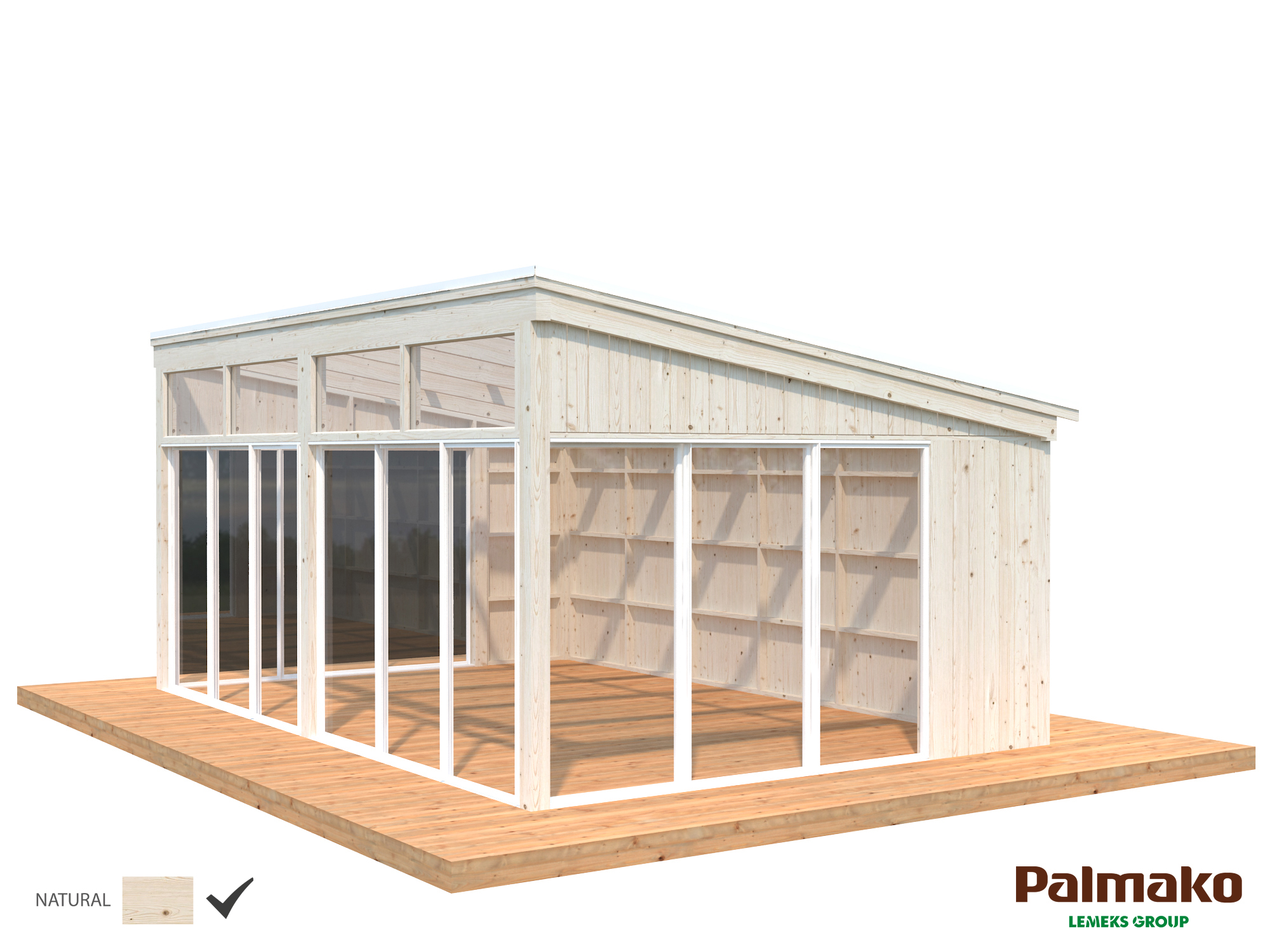 Tak och golv består av 18 mm råspont, detta ingår i byggsatsen. Även behandlade bärlinor till grunden ingår. Själva grunden får man göra själv, material till detta medföljer ej. Hur grunden görs beror på markförhållanden, utseende på huset och vad man själv föredrar. Antingen kan en platta gjutas eller kan en plintgrund på exempelvis trädgårdsplattor eller lättklinkerblock användas.