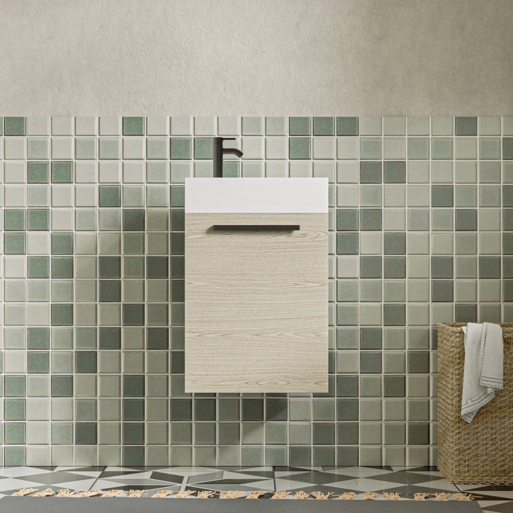 Denna vägghängda kommod är perfekt för det mindre badrummet, gästtoaletten eller där du helt enkelt vill spara plats utan att kompromissa med design. Möbeln är tillverkad i MDF med slitstark melaminyta i en ljus träfinish som ger ett ljust, fräscht och naturligt intryck. Det svarta handtaget ger en modern kontrast och ett stilrent helhetsintryck.