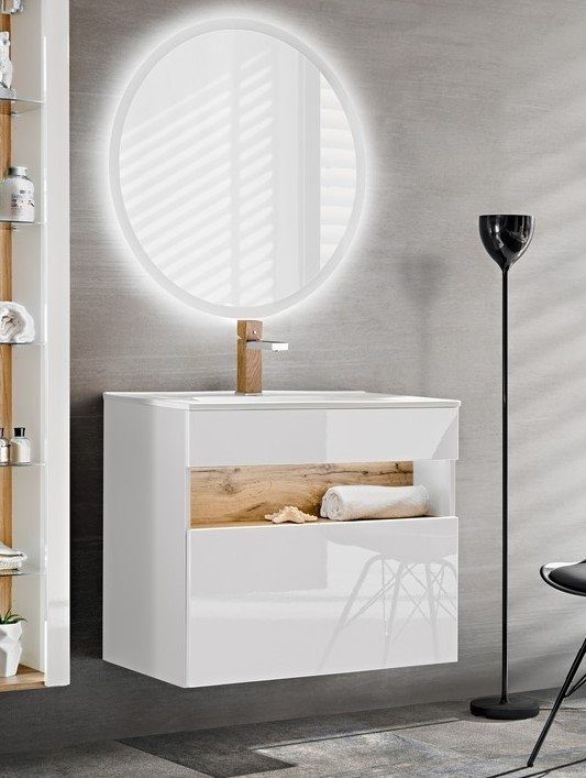 Möbelserien är akompanjerad av en rund spegel med LED-belysning som ger ett modernt intryck.