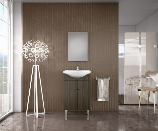 Bright möbelpaket från Nordamist med ett golvstående tvättställskåp i wenge ek-finish, tvättställ av porslin och en spegel.
