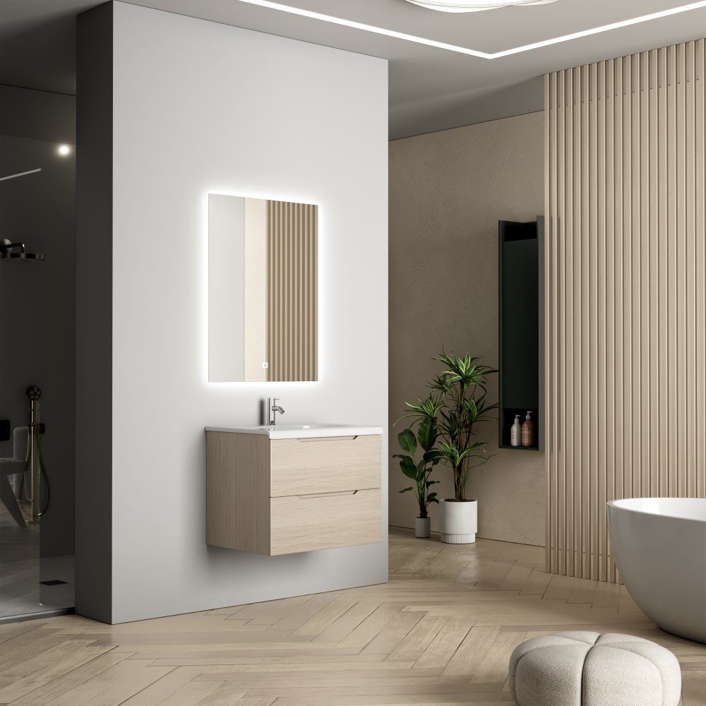 Badrumspaketet kombinerar modern design med praktisk förvaring. Kommoden är tillverkad av MDF med melaminbeläggning för hållbarhet och stil, och är utrustad med två mjukstängande lådor samt en mjukstängande dörr som ger enkel åtkomst och gott om förvaringsutrymme. Det högkvalitativa keramiska handfatet är slitstarkt och lätt att rengöra, vilket gör det perfekt för daglig användning. Den stilrena LED-spegeln har en kopparfri spegel och erbjuder dimbar belysning via en touch-kontroll för en modern touch.