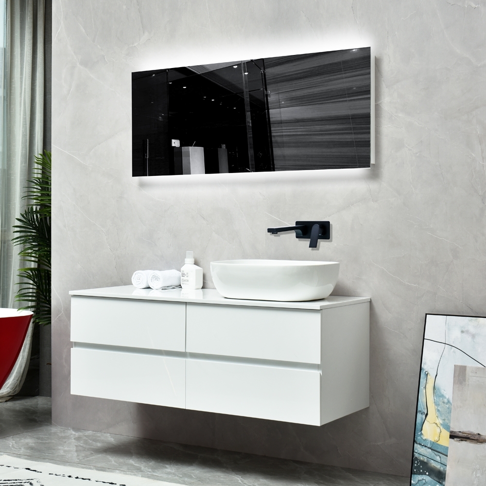 Amsterdam är ett badrumspaket i modern design med tre delar, tvättställsskåp, handfat och spegel med belysning i vit högglans. Dess vita färg i kombination med enkel design gör att badrumsinredningen passar in varstans, inte minst i en modern miljö.