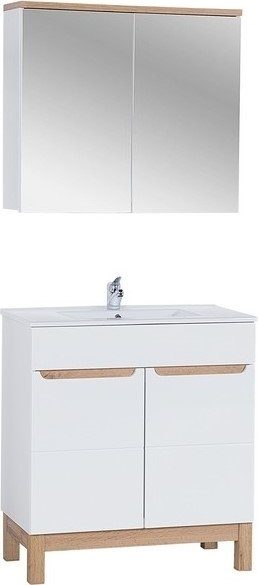 Möbelsetet innehåller tvättställsskåp, tvättställ och spegelskåp.