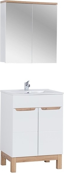 Möbelsetet innehåller tvättställsskåp, tvättställ och spegelskåp.