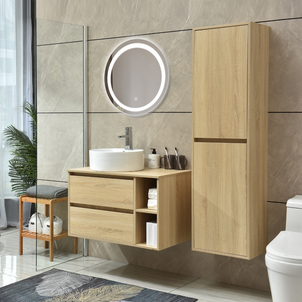 Badrumspaket Berlin har fyra delar inkluderat som ger dig ett ljust möblemang med naturlig träton som bidrar med värme i ditt badrum. Möblerna är stilrena med frästa kanter som fungerar som handtag. Det rena formspråket är modernt och inte minst det ovanpåliggande handfatet. Detta runda handfat och spegel kombinerar de kantiga möblerna fint.