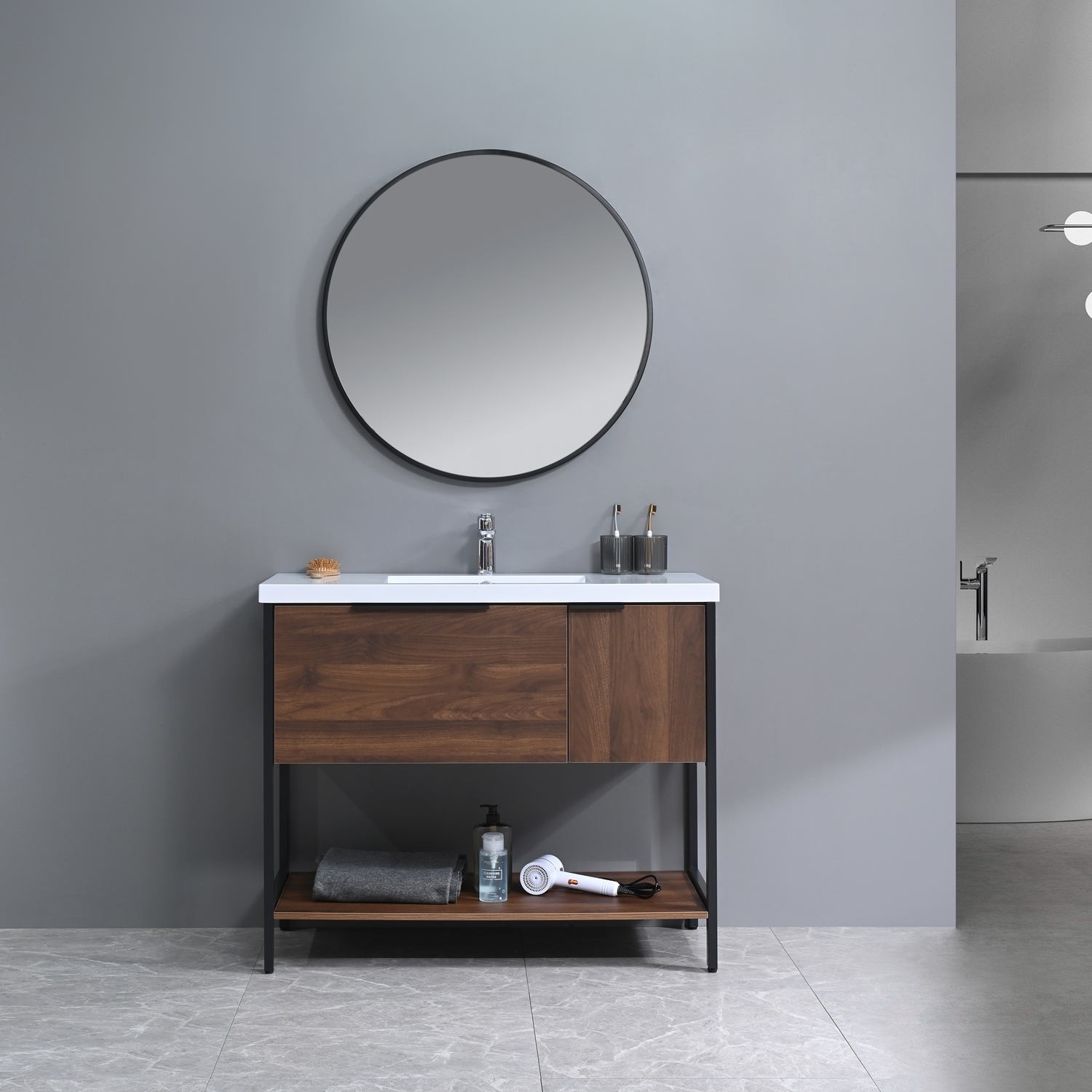 Skapa en stilfull och funktionell badrumsupplevelse med detta badrumsmöbelset som inkluderar ett elegant tvättställskåp, ett stilrent tvättställ och en klassisk rund spegel. Tvättställsskåpet är tillverkat av MDF-board med en slitstark melaminbeläggning som ger både hållbarhet och en modern träfinish. Skåpets praktiska design inkluderar en låda och en dörr som ger gott om utrymme för förvaring av dina badrumsartiklar, vilket hjälper till att hålla ditt badrum organiserat och snyggt.