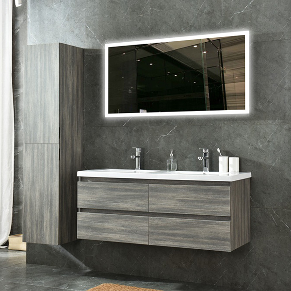 Ella i modern träimitation har led belysning runt spegeln som förstärker den moderna looken och ger dig bra ljus vid rakning och sminkning. Det utformade mellanrummet ersätter handtag och knoppar och bidrar med ett minimalistiskt uttryck.