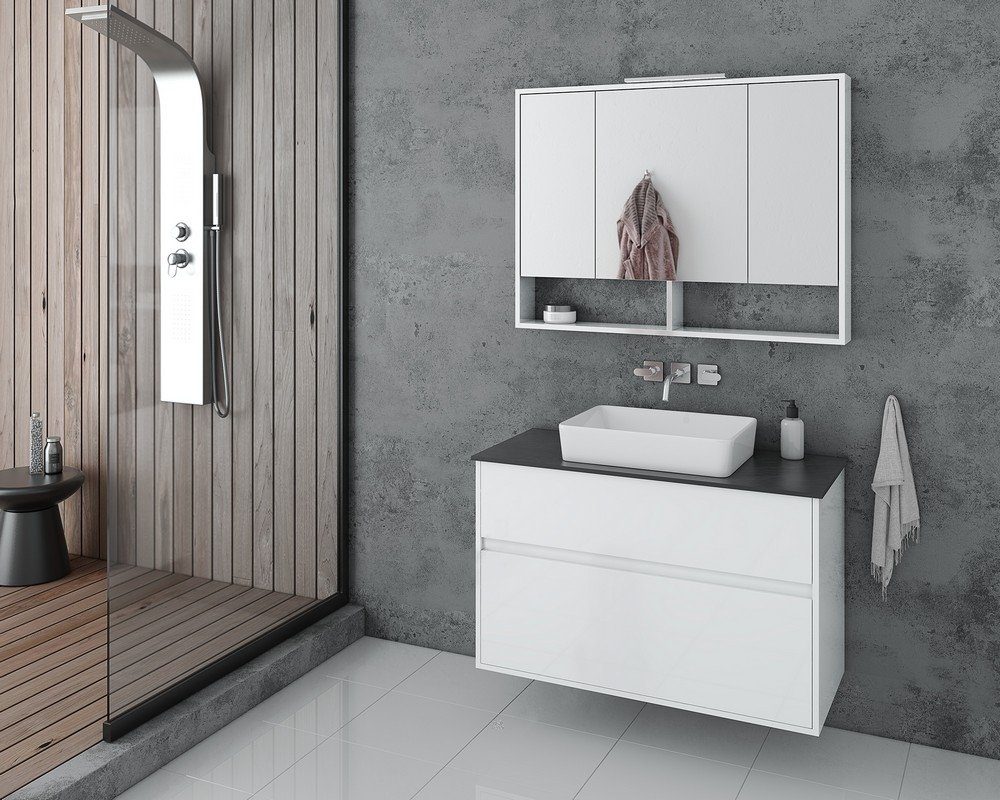Instinct möbelpaket från Nordamist erbjuder en modern och stilren lösning för ditt badrum. Det vita vägghängda tvättställsskåpet med glansig lackad finish ger ett elegant och luftigt intryck. De rymliga lådorna gör det enkelt att organisera dina badrumsartiklar, medan plywoodskivan tillsammans med porslinshandfatet skapar en hållbar och sofistikerad yta.
