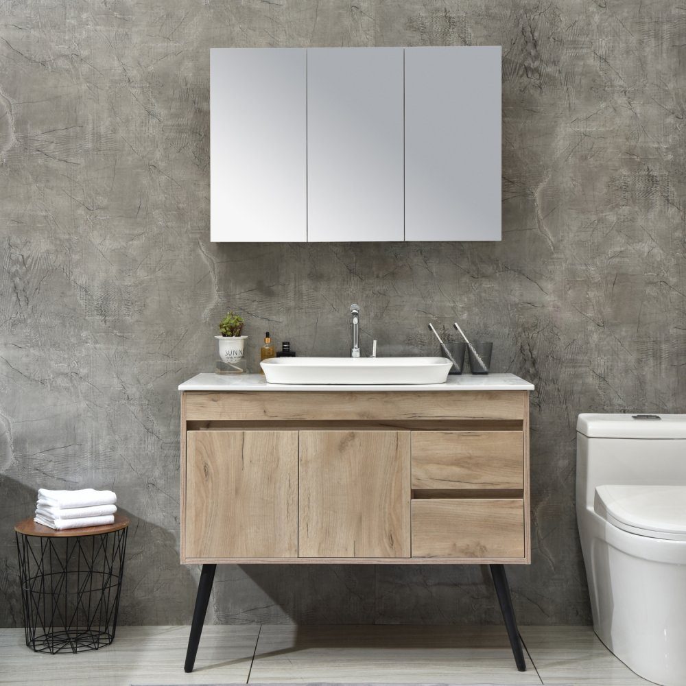Badrumspaket Melina, tvättställ och badrumsskåp med spegel. Tvättstället är tillverkat av 15mm tjock MDF klädd med melamine med trä utförande, toppskivan har blank vitt utföande. Tvättstället har ett skåp och två rymliga lådor för praktiskt förvaring, samtliga med mjuk-stängning funktion. Handfat i vit keramik. Badrumsskåpet är av MDF med melamine och skåpsdörrar med speglar. Insidan har 4 stycken rymliga hyllplan. Tvättstället är CE-certifierat.