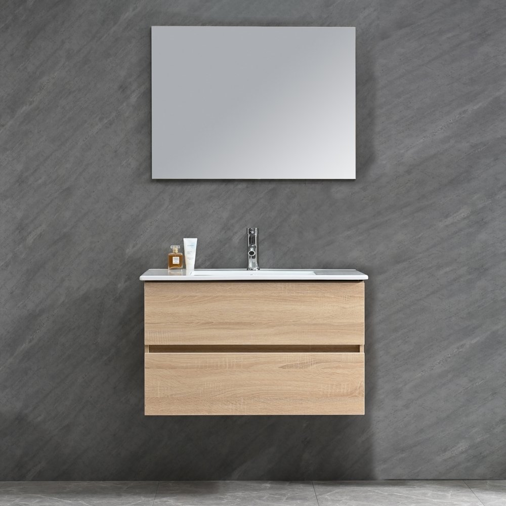 Badrumspaket Nordic Oak erbjuder en stilren och funktionell lösning för det moderna badrummet. Med sin vackra träimitation kombinerar detta set naturlig skandinavisk estetik med modern minimalism. Tvättställskommoden har en enkel, praktisk design och är utrustad med två rymliga lådor som ger generös förvaring och enkel åtkomst till dina badrumsartiklar. Tack vare de integrerade handtagen bevaras den rena, minimalistiska linjen på möbeln.