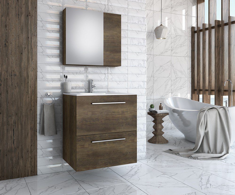 Puro från Nordamist är ett badrumsmöblemang med mörk träimitation som tillför en varm och mjuk känsla till det annars ofta hårda och kalla badrums materialen. Den varma trätonen kan passas in i den stilrena klassiska miljön såsom den bohemiska.