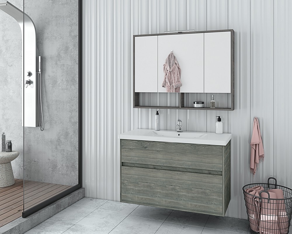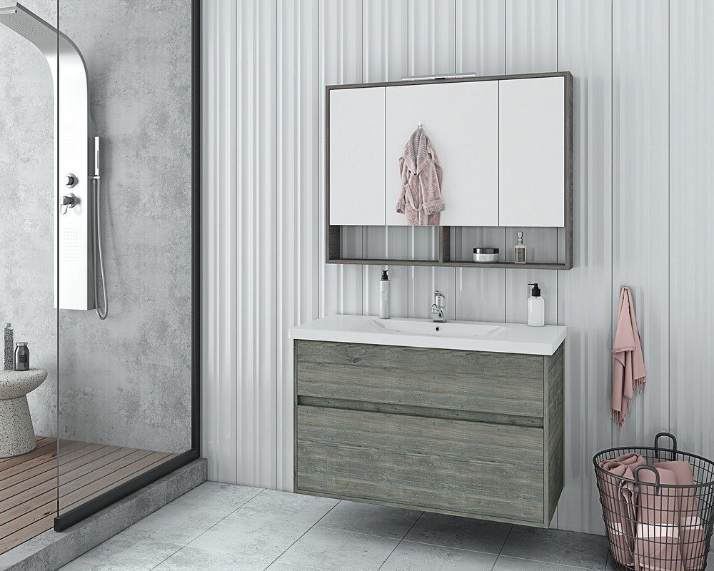 Instinct möbelpaket från Nordamist med ett rökfärgat väggfäst tvättställsskåp, tvättställ med integrerat porslinshandfat och spegelskåp.