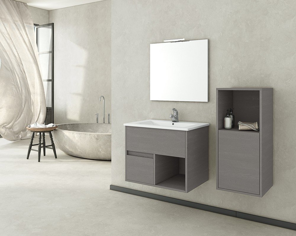 Sorrento möbelpaket från Nordamist med ett cementfärgat vägghängt tvättställsskåp i trä, sidoskåp, porslinsskiva & integrerat porslinstvättställ, väggspegelenhet och belysningspaketet Pandora.