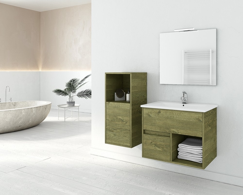 Sorrento möbelpaket från Nordamist med ett naturfärgat vägghängt tvättställsskåp i trä, sidoskåp, porslinsskiva & integrerat porslinstvättställ, väggspegelenhet och belysningspaketet Celia.