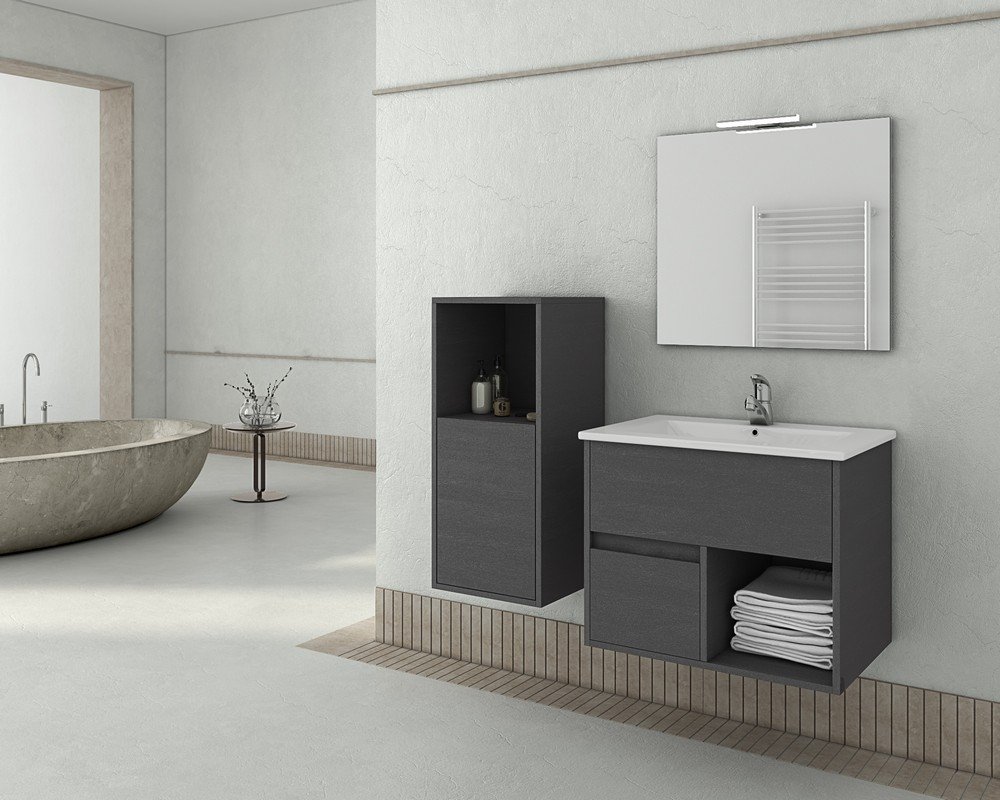 Sorrento möbelpaket från Nordamist med ett grafitfärgat vägghängt tvättställsskåp i trä, sidoskåp, porslinsskiva & integrerat porslinstvättställ, väggspegelenhet och belysningspaketet Pandora.