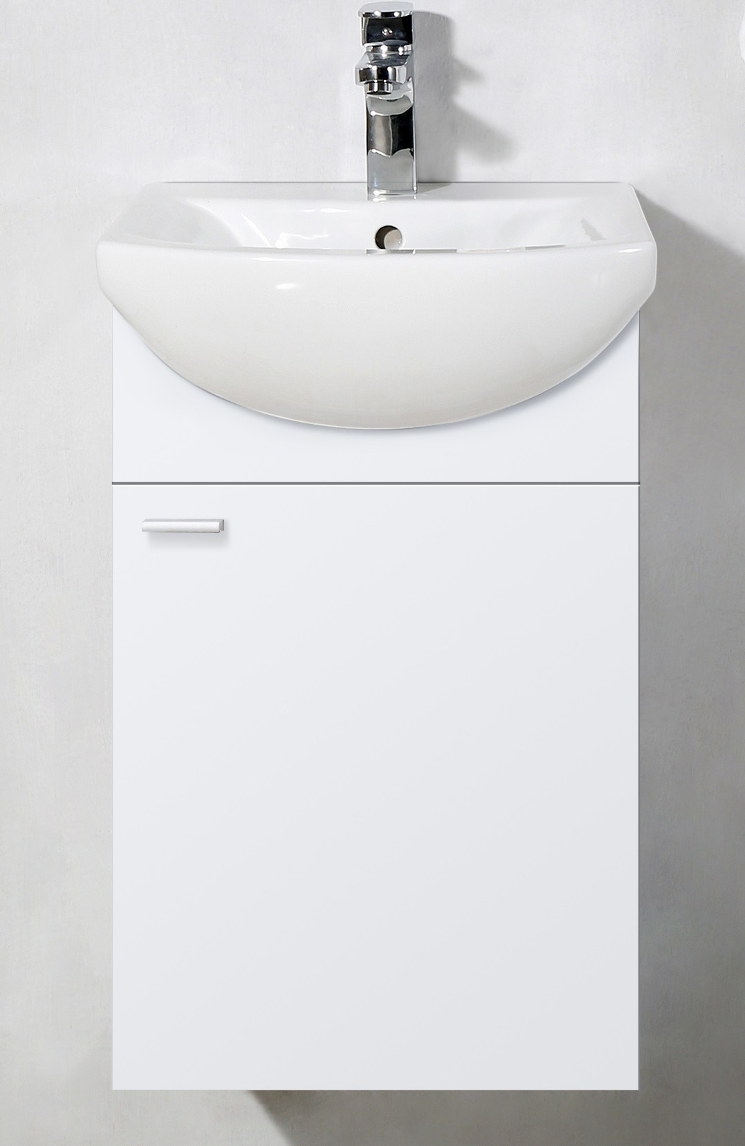 MF45L Möbelpaket som innehåller vitt keramiktvättställ och skåp i blank vit färg.