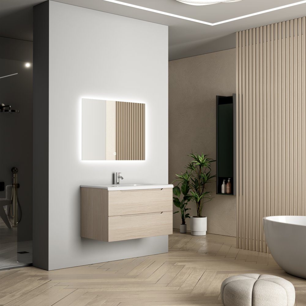 Badrumspaketet kombinerar modern design med praktisk förvaring. Kommoden är tillverkad av MDF med melaminbeläggning för hållbarhet och stil, och är utrustad med två mjukstängande lådor samt en mjukstängande dörr som ger enkel åtkomst och gott om förvaringsutrymme. Det högkvalitativa keramiska handfatet är slitstarkt och lätt att rengöra, vilket gör det perfekt för daglig användning. Den stilrena LED-spegeln har en kopparfri spegel och erbjuder dimbar belysning via en touch-kontroll för en modern touch.