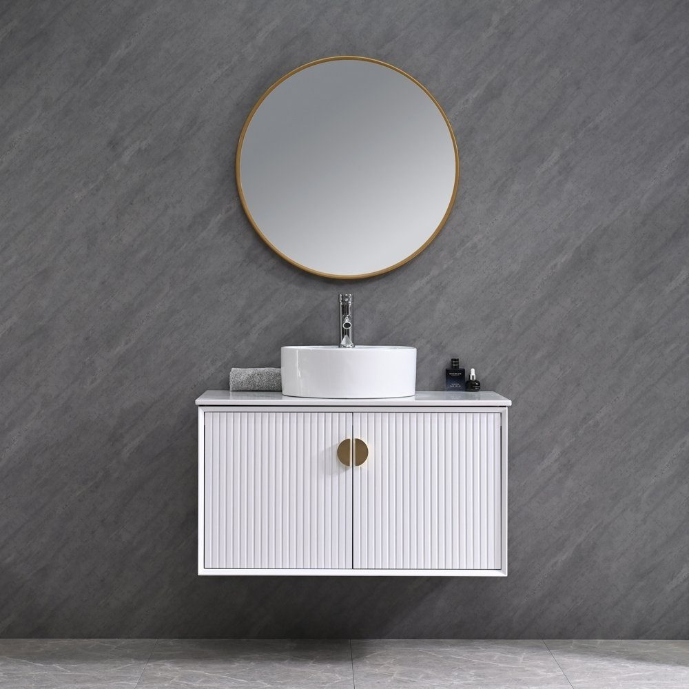 Badrumspaket har en tidlös och modern design som passar perfekt in i det skandinaviska hemmet. Med rena linjer och en vit yta ger detta badrumsmöbelset en känsla av ljus och rymd. Den eleganta tvättställskommoden har två dörrar och ett centralt placerat metallhandtag i en guldton, vilket ger ett subtilt men lyxigt uttryck. De vertikala linjerna på dörrarna skapar ett sofistikerat mönster som ger en extra touch av designkänsla.