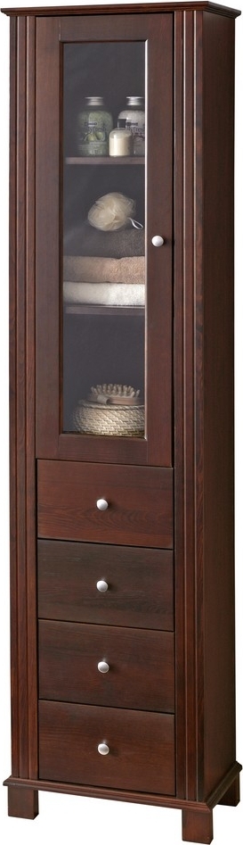 Skåpet medför värme till badrummet med sin mörka träton och det stiliga vitrinet ger dig möjlighet att ge badrummet ytterligare karaktär med fina detaljer eller handdukar på display. Dess något gustavianska stil ser du i de frästa detaljerna på stommen tillsammans med avslutande kantlist. Inuti skåpet har du god förvaringsyta med två hyllplan och fyra lådor.