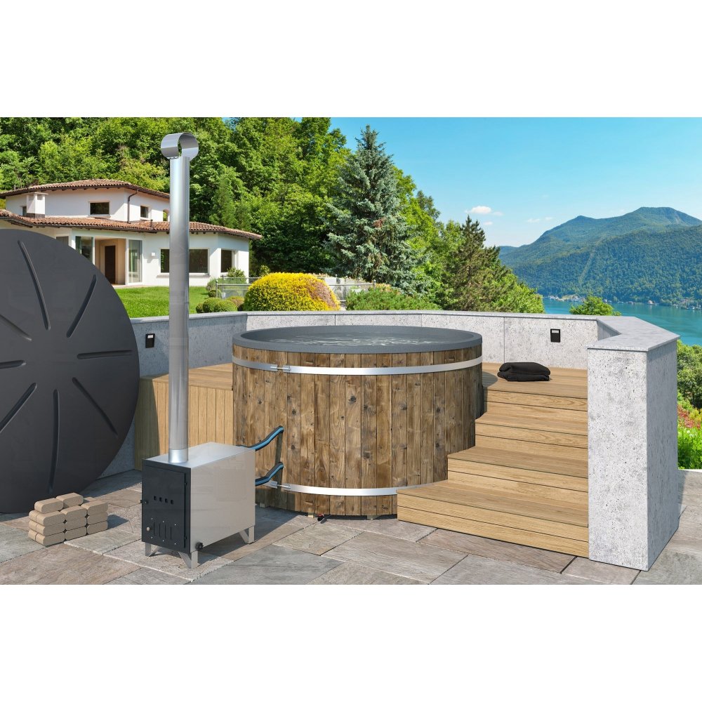 Lyxa till det vid uteplatsen eller på terassen med en badtunna med uppvärmning via vedeldning.