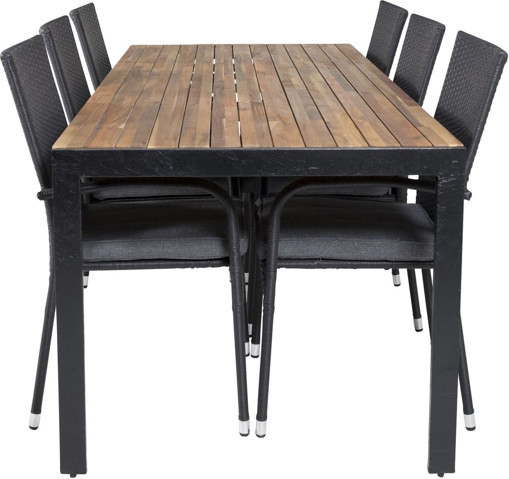 Matgrupp med ett bord och 6 stycken stolar. Stolarna är tillverkade av Konstrotting/polyester och bordet är tillverkat av Akacia/Aluminium. Dynor ingår.