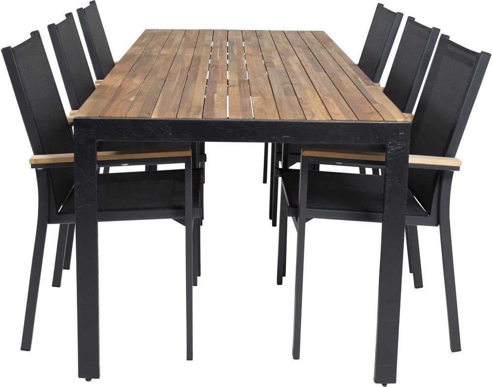 Matgrupp med ett bord och 6 stycken stolar. Stolarna är tillverkade av Teak/Aluminium/Textilene och bordet är tillverkat av Akacia/Aluminium. Stolarna är stapelbara. Dynor ingår.