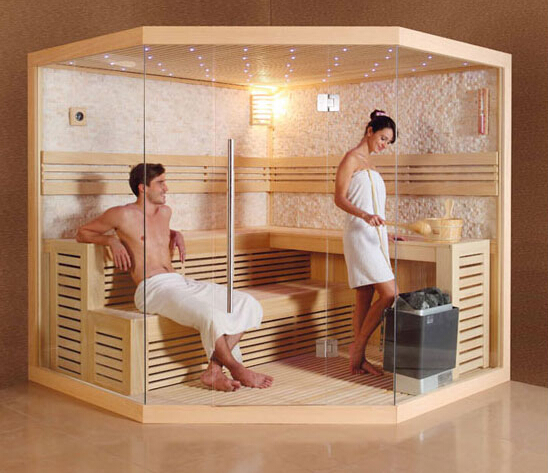 Modern bastu med touchkontrollenhet och kraftfullt bastuaggregat.