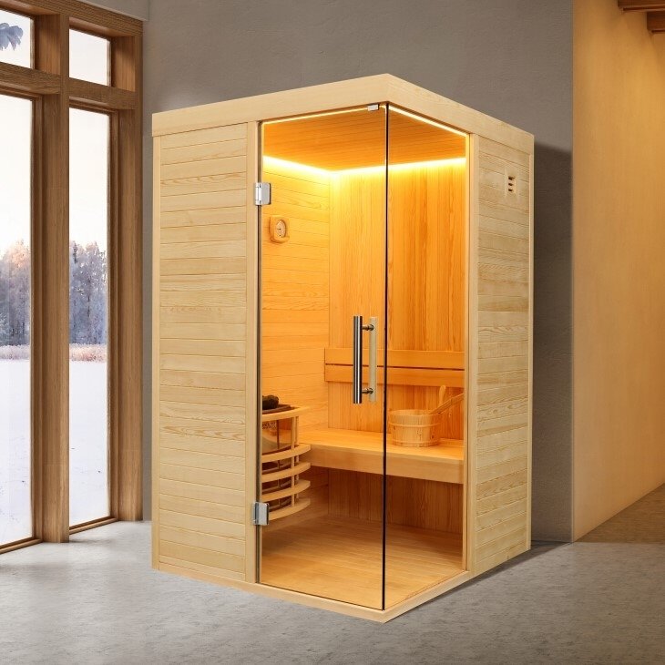 Komplett bastupaket med bastuaggregat och styrenhet. Bastun är lämplig för 1-2 personer. Styrenheten har funktioner för musikuppspelning via bluetooth och FM-radio samt funktioner för reglering av temperatur och tidsinställningar.