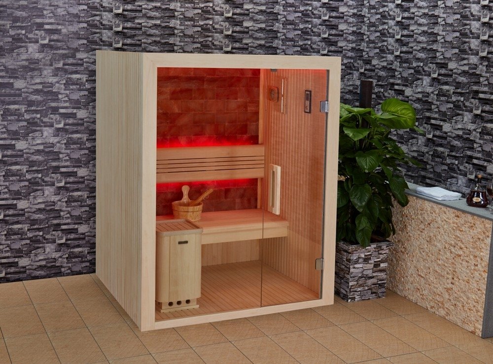 Modern bastu tillverkad i hemlock och asp. Bastupaketet är komplett med bastuaggregat och styrenhet. Styrenheten har FM-radio och bluetooth samt funktioner för reglering av temperatur och tidsinställningar.