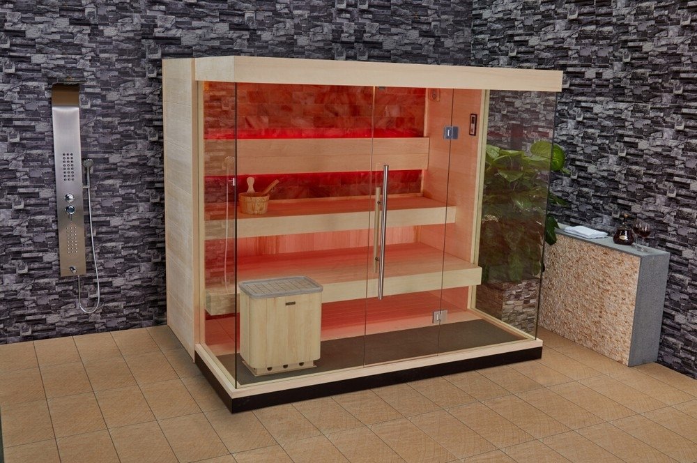 Modern bastu tillverkad i hemlock och asp. Bastupaketet är komplett med bastuaggregat och styrenhet. Styrenheten har FM-radio och bluetooth samt funktioner för reglering av temperatur och tidsinställningar.