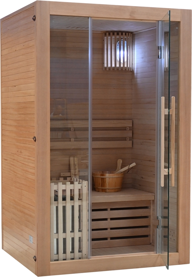 Klassisk bastu med en Harvia bastuugn och gott om utrymme för 2 personer. Materialet är helt av canadensisk Hemlock, med glaspaneler till fönster och dörr. Bastun har belysning och termometer.