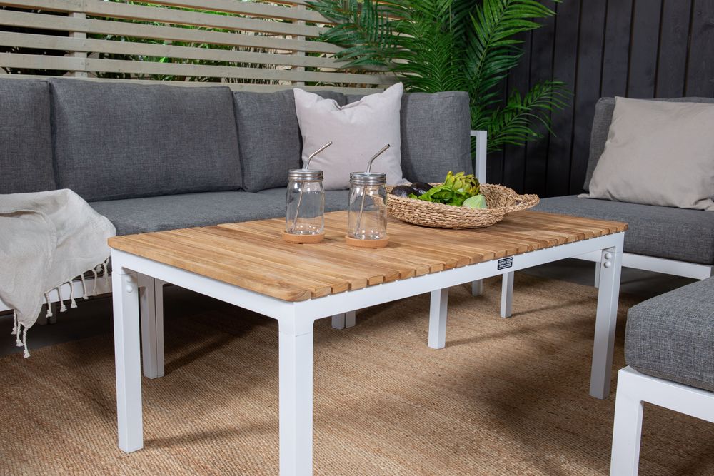Soffbord med underrede av vit metall och toppskiva av teak.