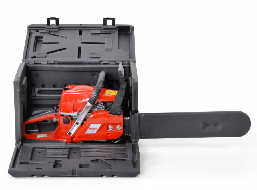 Bensindriven motorsåg med 2-taktsmotor som levererar 2,7 hästkrafter. Svärdslängd 40 cm. Samt medföljande förvaringslåda.