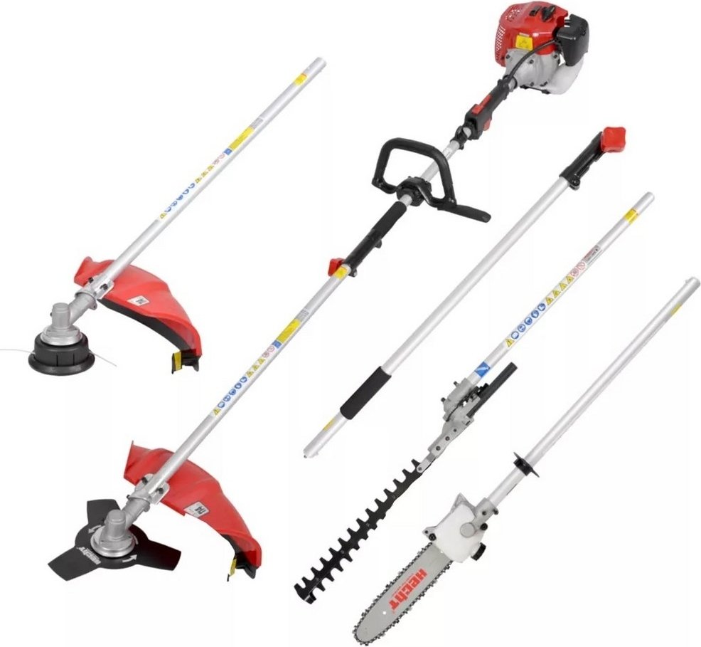 Bensindrivet multiredskap - Röjsåg/ grästrimmer, häcksax och grensåg. Drift, 2-taktsmotor med 1,5 hästkraft.