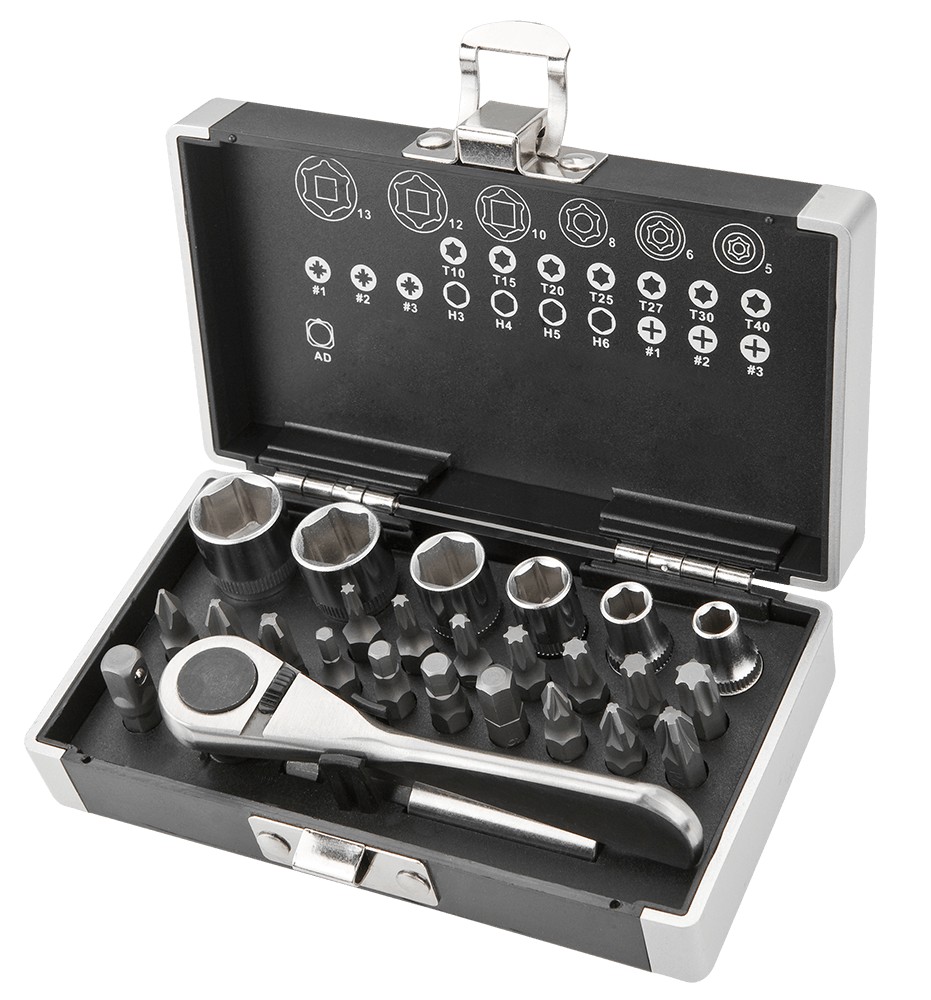 PH1, PH2, PH3, SL4, SL5, SL6, PZ1, PZ2, PZ3, HEX3, HEX4, HEX5, HEX6, TX10, TX15, TX20, TX25, TX27, TX30, TX40, hylsor 5, 6, 8, 10, 12, 13 mm.