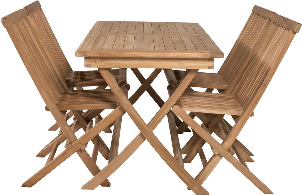 Matgrupp med ett bord och 4 stycken stolar. Stolarna är tillverkade av Teak och bordet är tillverkat av Teak.