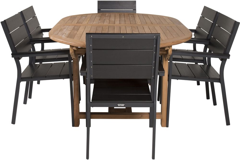 Matgrupp med ett bord och 6 stycken stolar. Stolarna är tillverkade av Aluminium/Polywood och bordet är tillverkat av Teak. Stolarna är stapelbara.